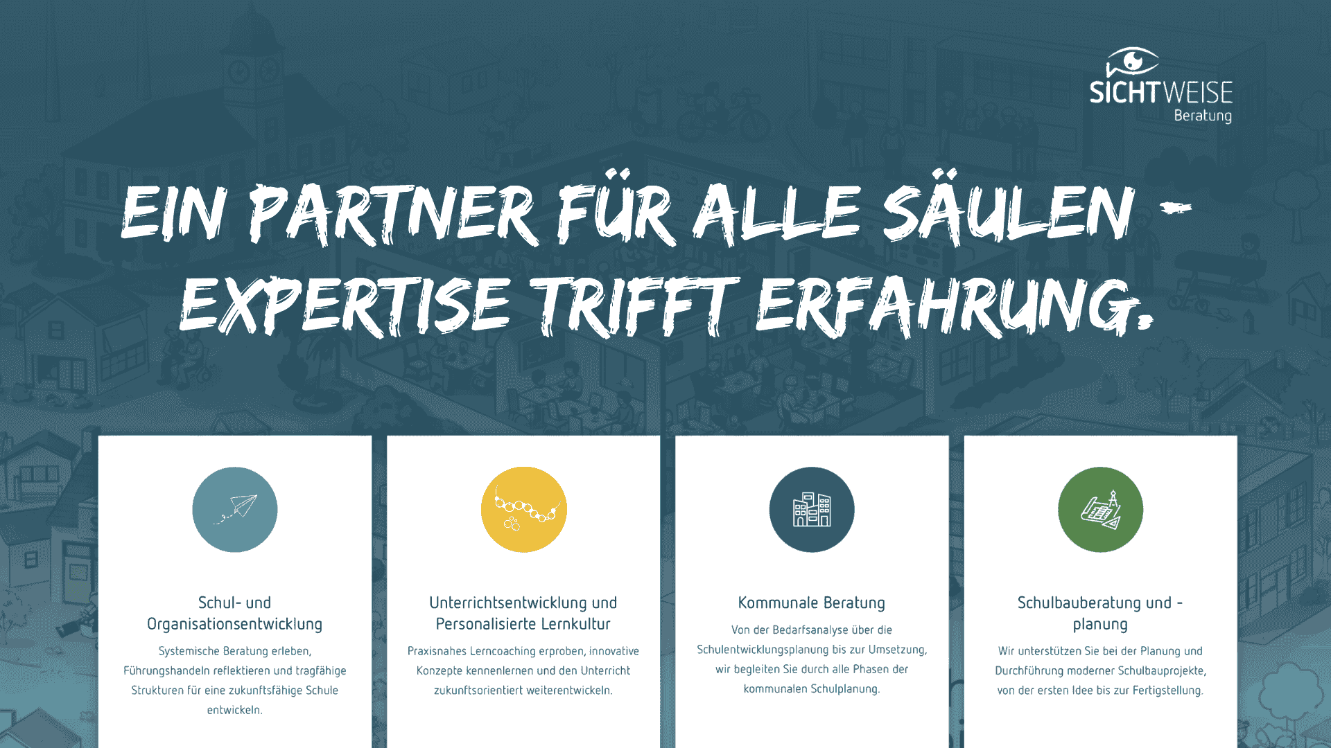 In einer komplexen und sich ständig wandelnden Bildungslandschaft ist es entscheidend, auf einen Partner zu setzen, der nicht nur über jahrzehntelange Erfahrung, sondern auch über innovative Ansätze verfügt. Bei SICHT.weise Beratung kombinieren wir Tradition mit frischen Ideen und einem starken Netzwerk aus Experten. Unser Ansatz ist praxisnah, partizipativ und darauf ausgerichtet, Ihre Ziele nachhaltig zu erreichen. Gemeinsam mit Ihnen entwickeln wir zukunftsfähige Konzepte, die sowohl in der Schul- und Unterrichtsentwicklung als auch im Schulbau Maßstäbe setzen. Vertrauen Sie auf eine Beratung, die Ihre Vision in die Tat umsetzt.
