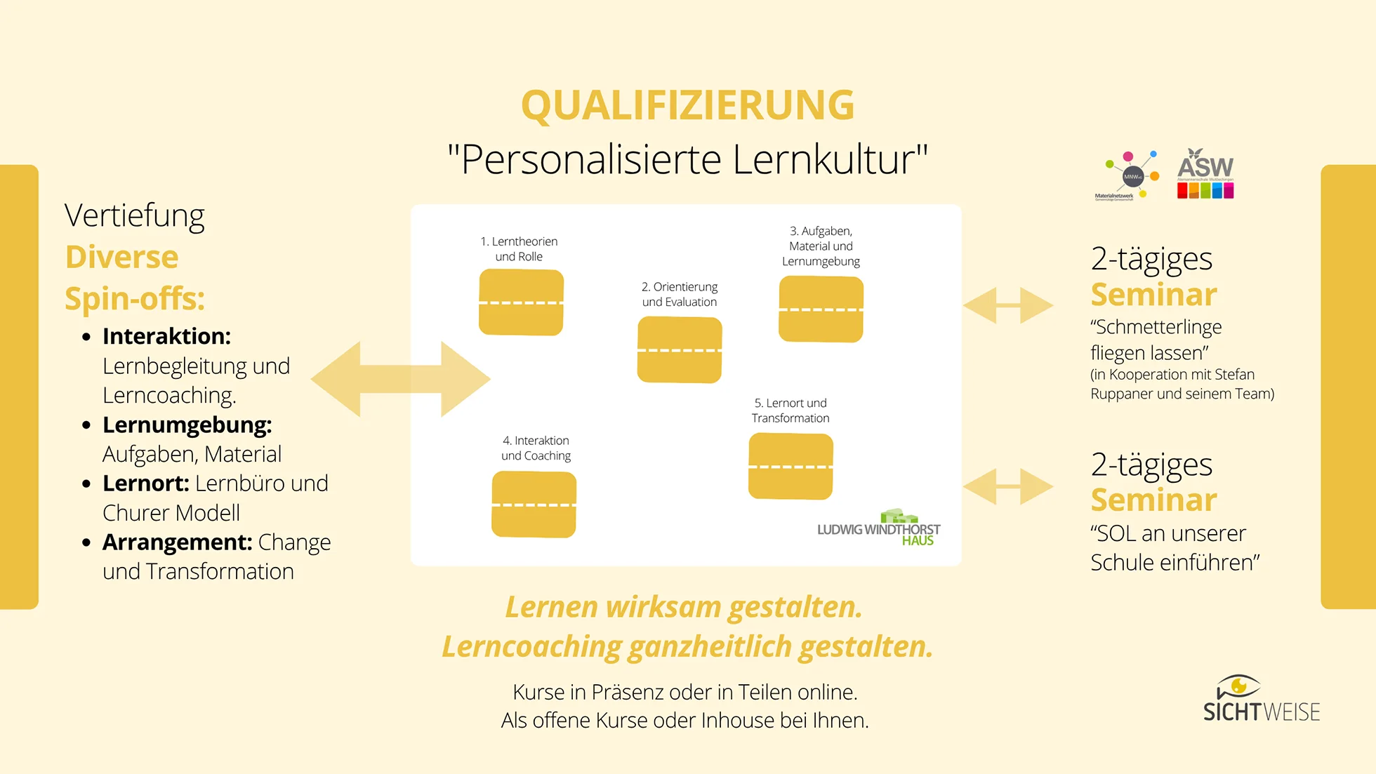 In fünf praxisnahen Modulen werden zentrale Bausteine wie Lerncoaching, Selbstorganisation, Kompetenzraster, Lernumgebungen und Schulentwicklung vertieft. Ergänzt wird die Qualifizierung durch zweitägige Seminare wie „Schmetterlinge fliegen lassen“ oder „SOL und Lernbüro“, die erste Einblicke und Umsetzungsimpulse bieten.